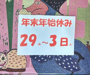 年末年始営業のおしらせ いつもご愛顧いただきありがとうございます 12月28日(日)迄、通常営業いたします 12月29日が月曜定休になりまして1月3日(土)までお休みを頂戴いたします ご来店の際はご注意くださいませ
